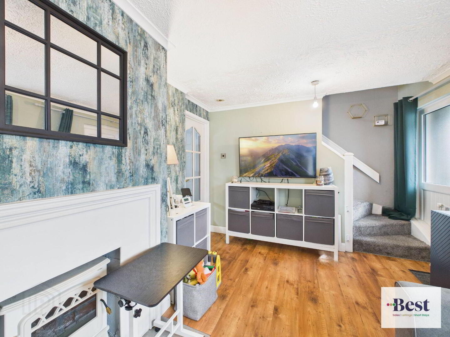 - Spacious and bright living room with wood effect laminate flooring, feature fireplace with white surround and stove.