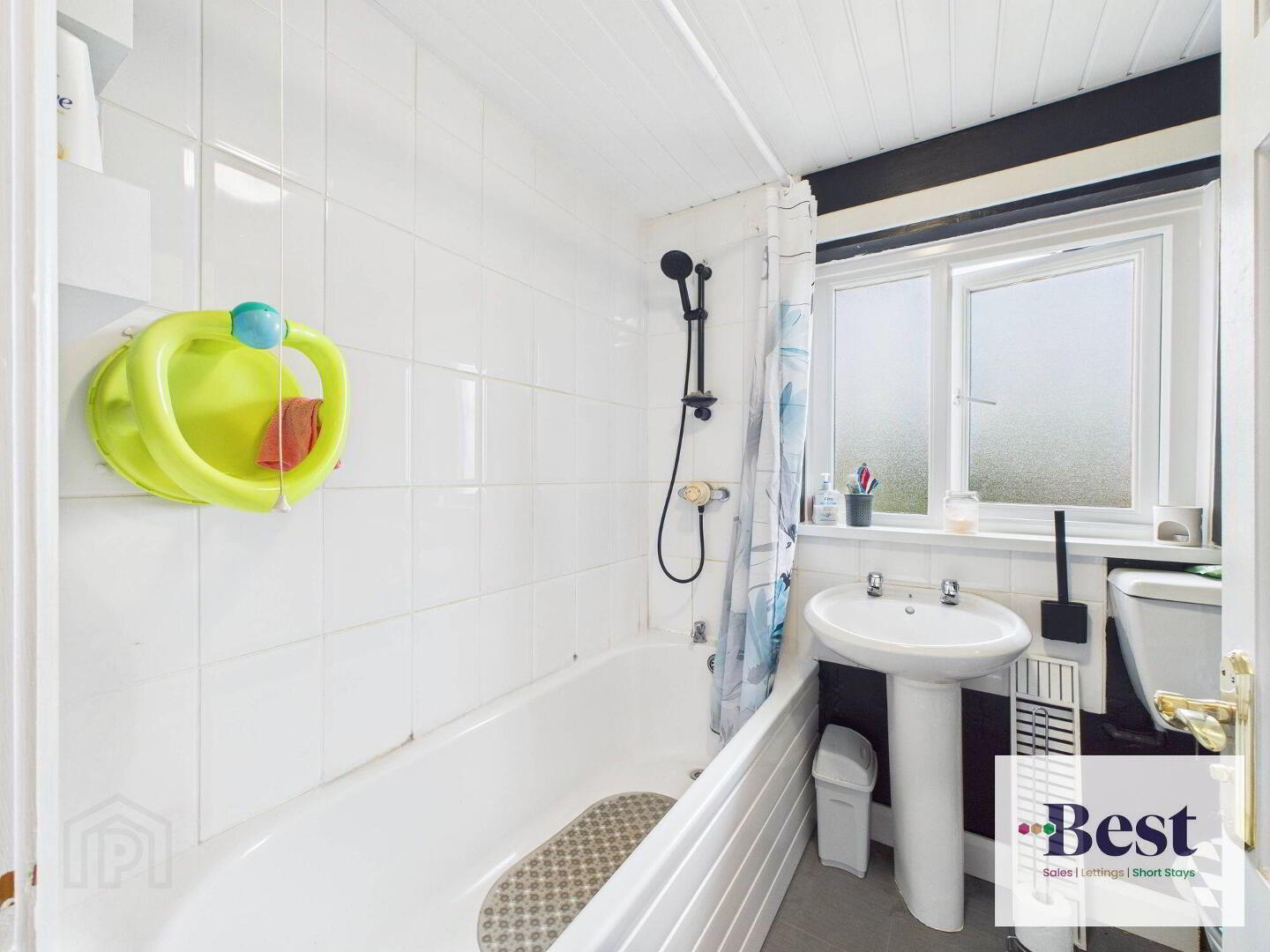 - Bright bathroom with white suite comprising of low flush WC, pedestal wash hand basin with hot and cold chrome taps. Bath with thermostatic bar shower. Grey vinyl flooring with ceramic white tiling on walls.