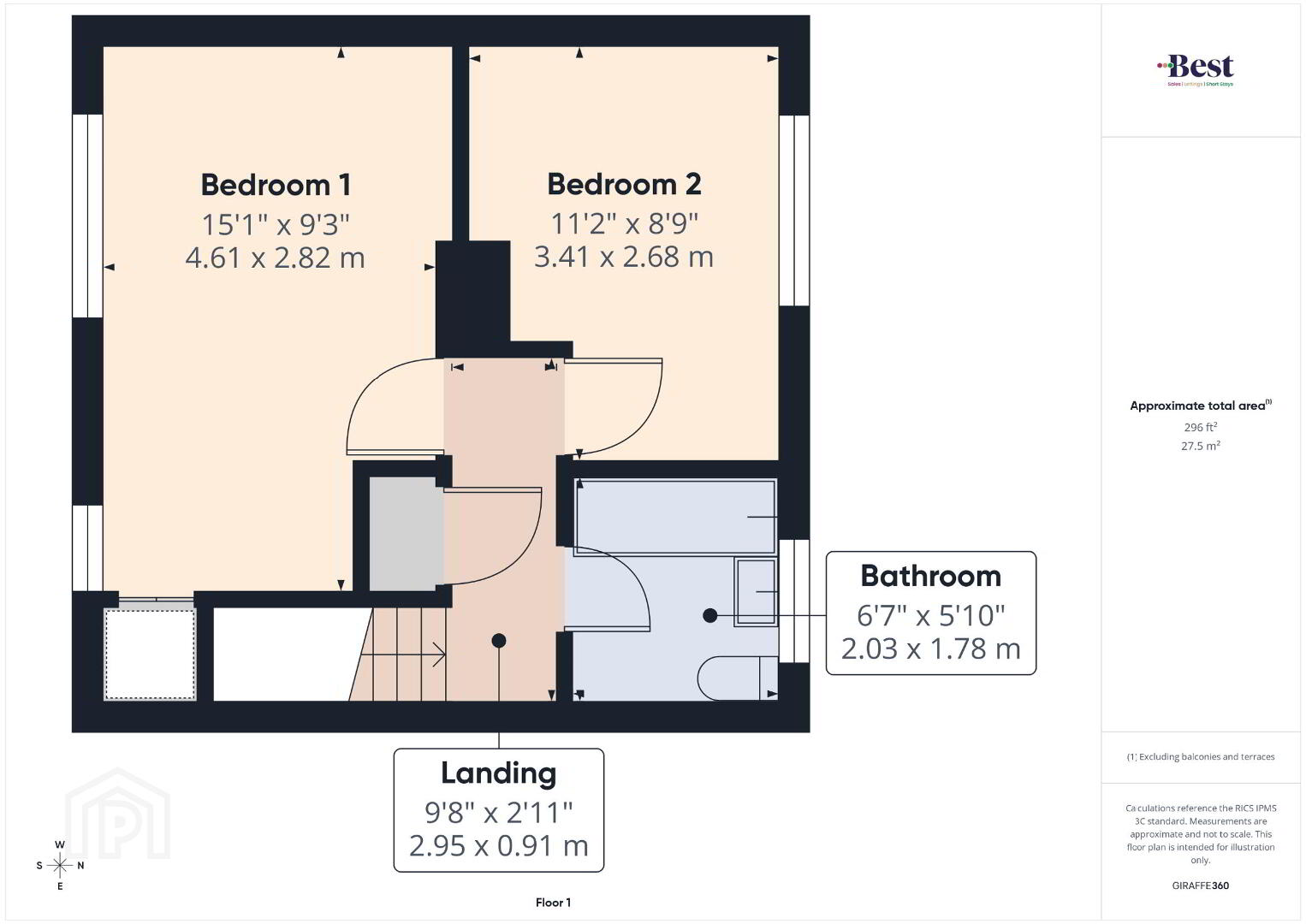 - Bedroom 1 2.82m x 4.61m (9'3 x 15'1)