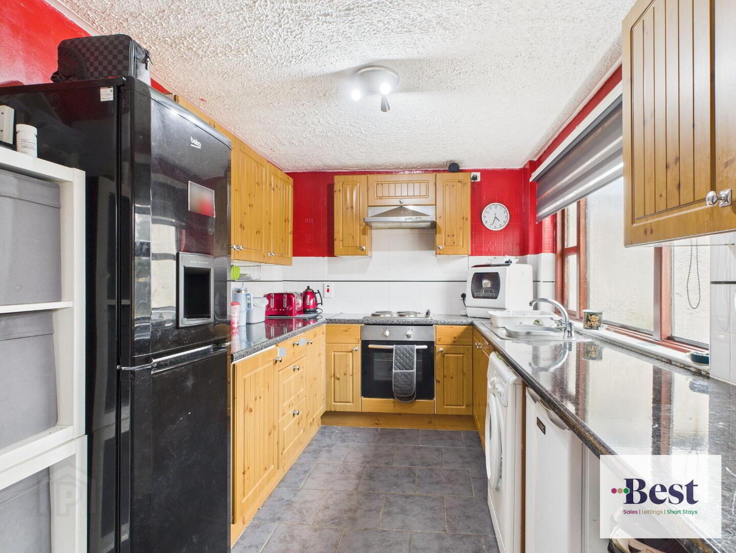 - Good sized kitchen with excellent range of high and low level units. Laminated worktops, integrated electric oven, 4 ring electric hob and under-counter space for washer / dryer. Space for freestanding fridge / freezer. Large rear facing window allowing lots of natural light with access to rear garden.