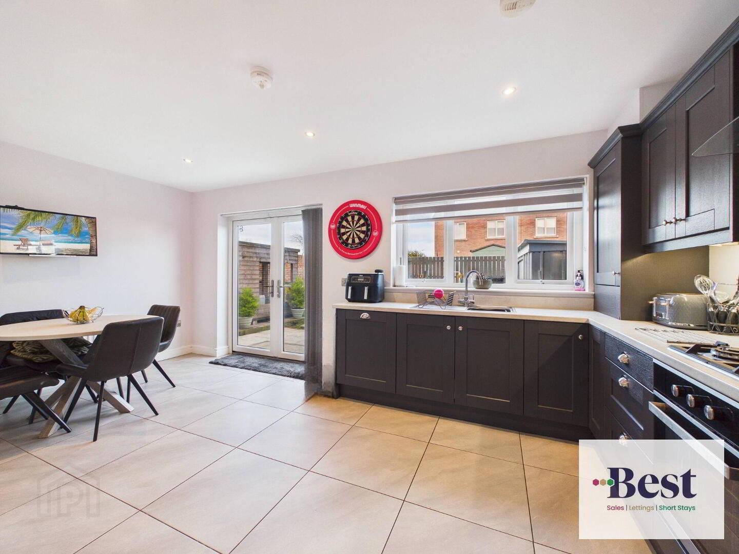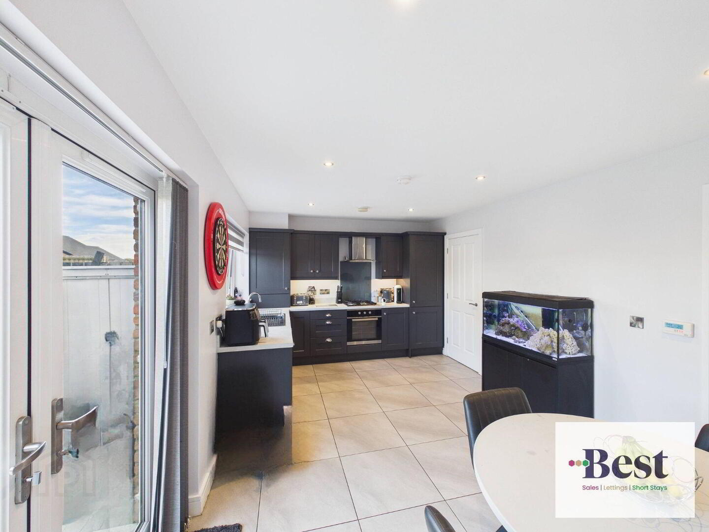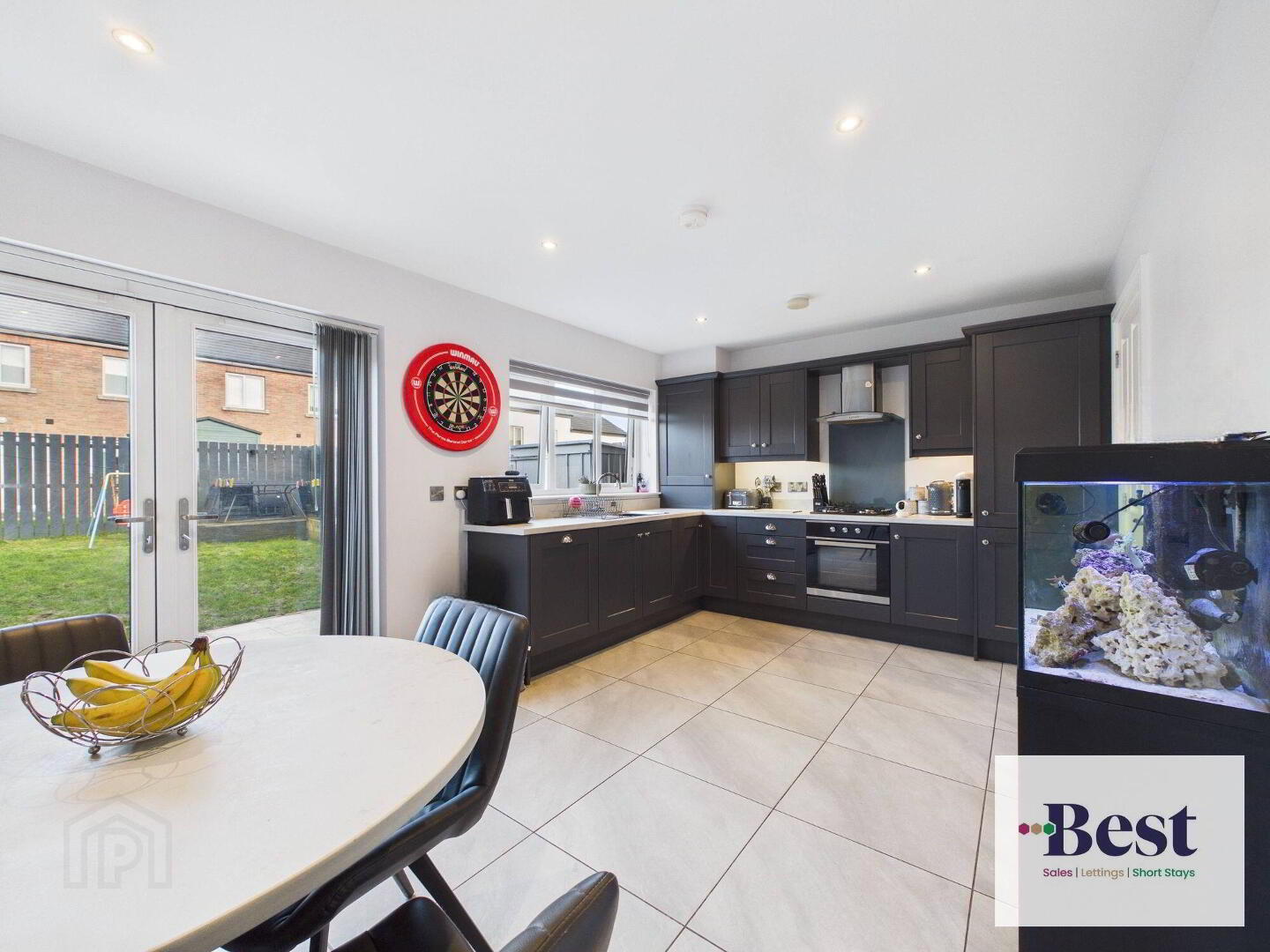 - Excellent range of high and low level units. Modern grey units with marble effect worktops. Gas hob with electric under oven. Integrated dishwasher and integrated fridge freezer. Ample space for dining. French Doors to rear garden. Tiled flooring