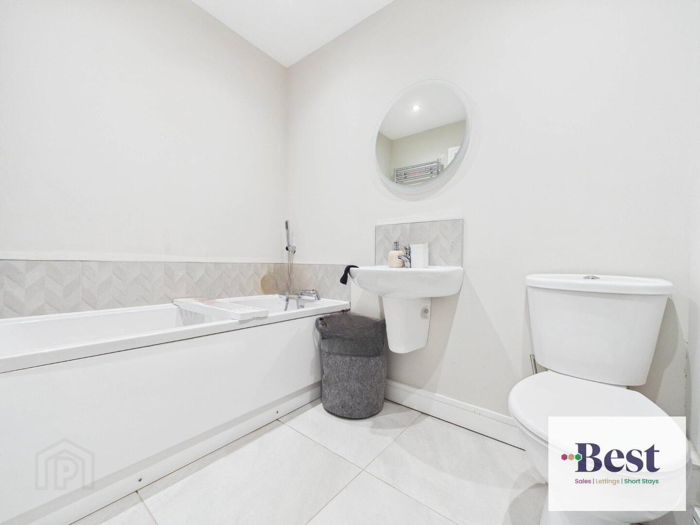 - White suite comprising low flush WC, pedestal wash hand basin, panelled bath. Crome towel rail. Tiled flooring.