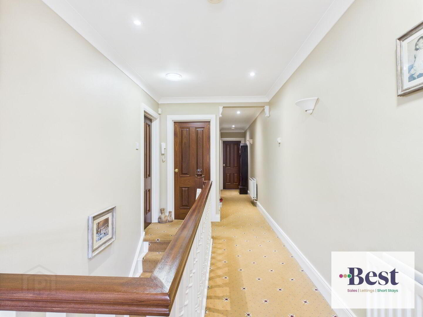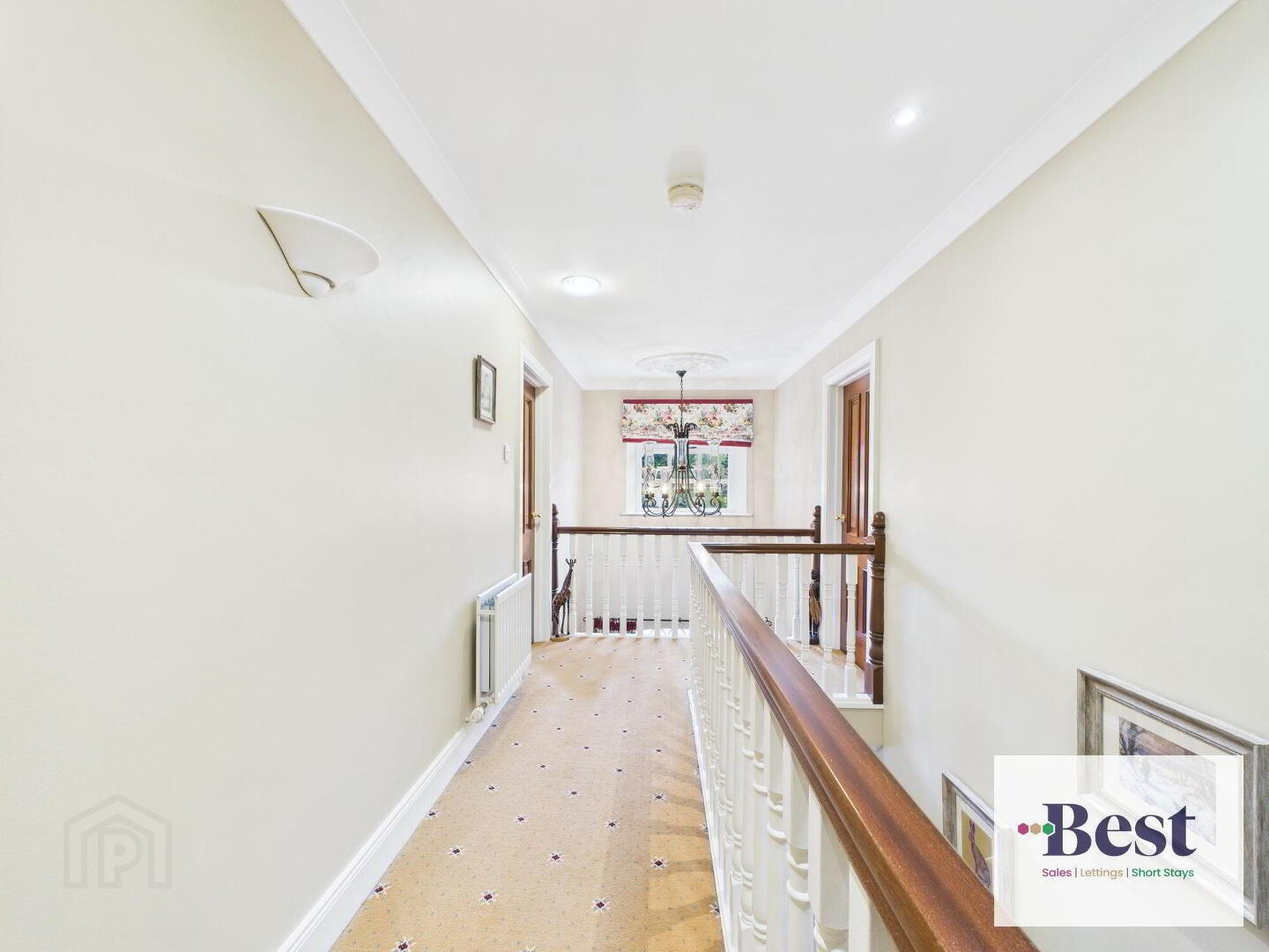 Lengthy landing with a mezzanine finish above the Entrance Hall allowing natural daylight to flow. Feature chandelier and coving. Generous walk in storage cupboard , hotpress with ample shelving.