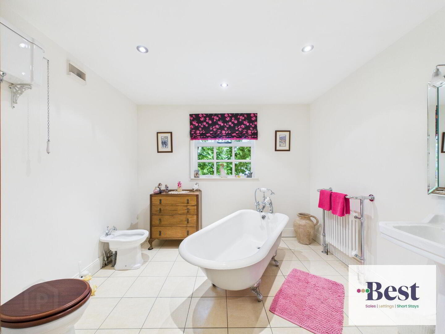 Special, tranquil space. Feature freestanding roll top bath with ball and claw feet, Victorian style high flush WC, pedestal wash hand basin and bidet. Traditional victorian style heated towel rail. Ceramic tiled flooring.