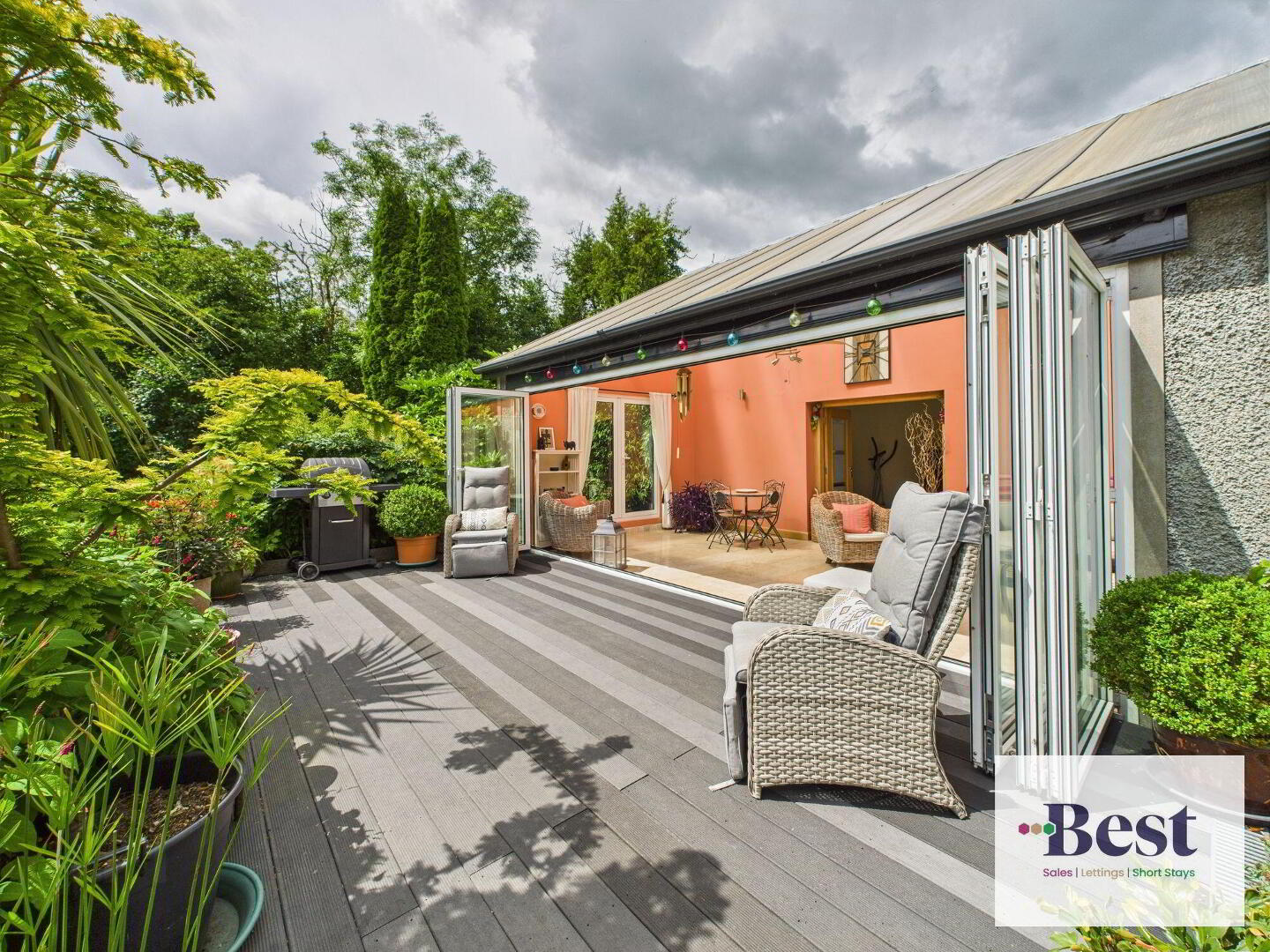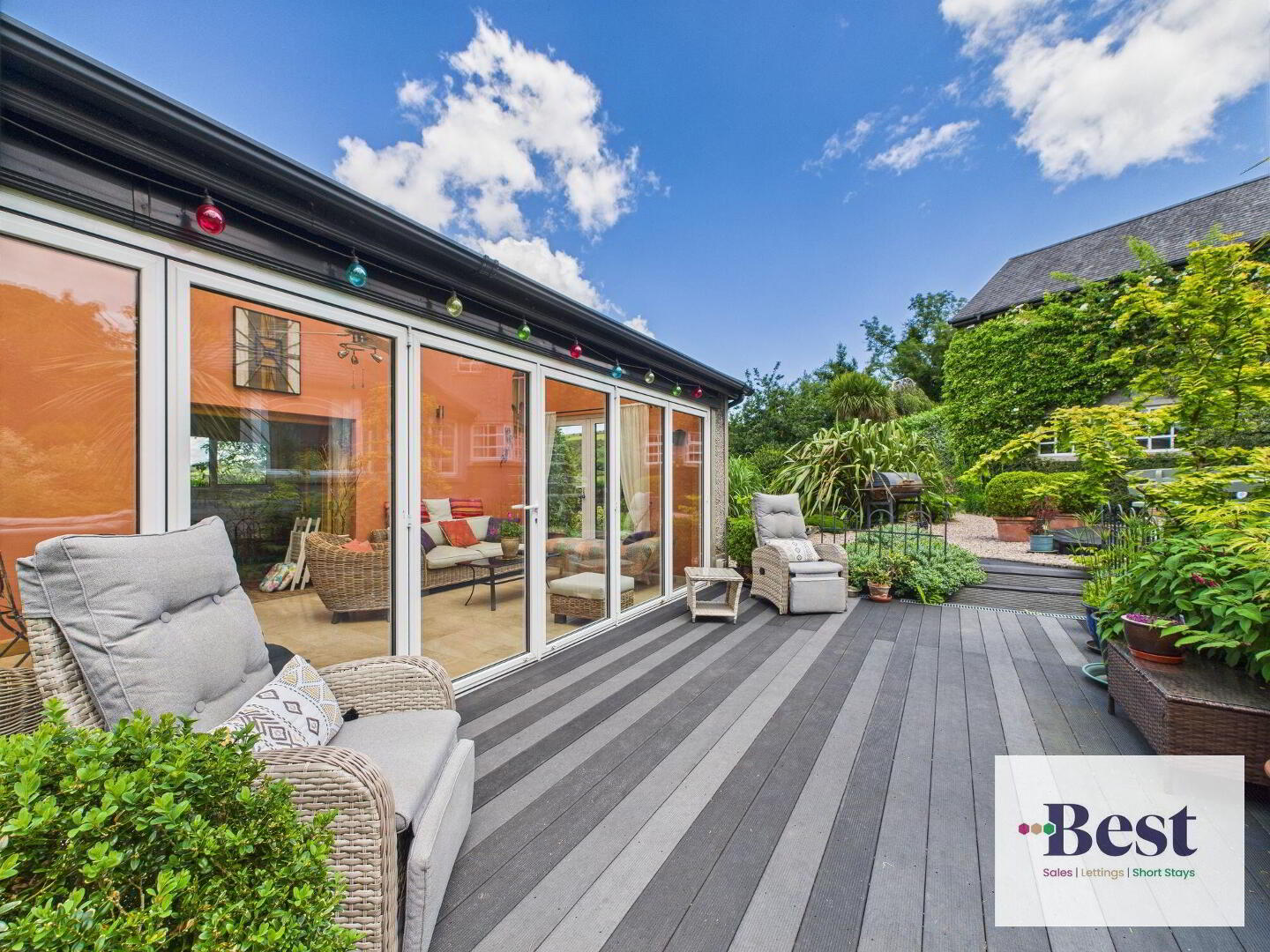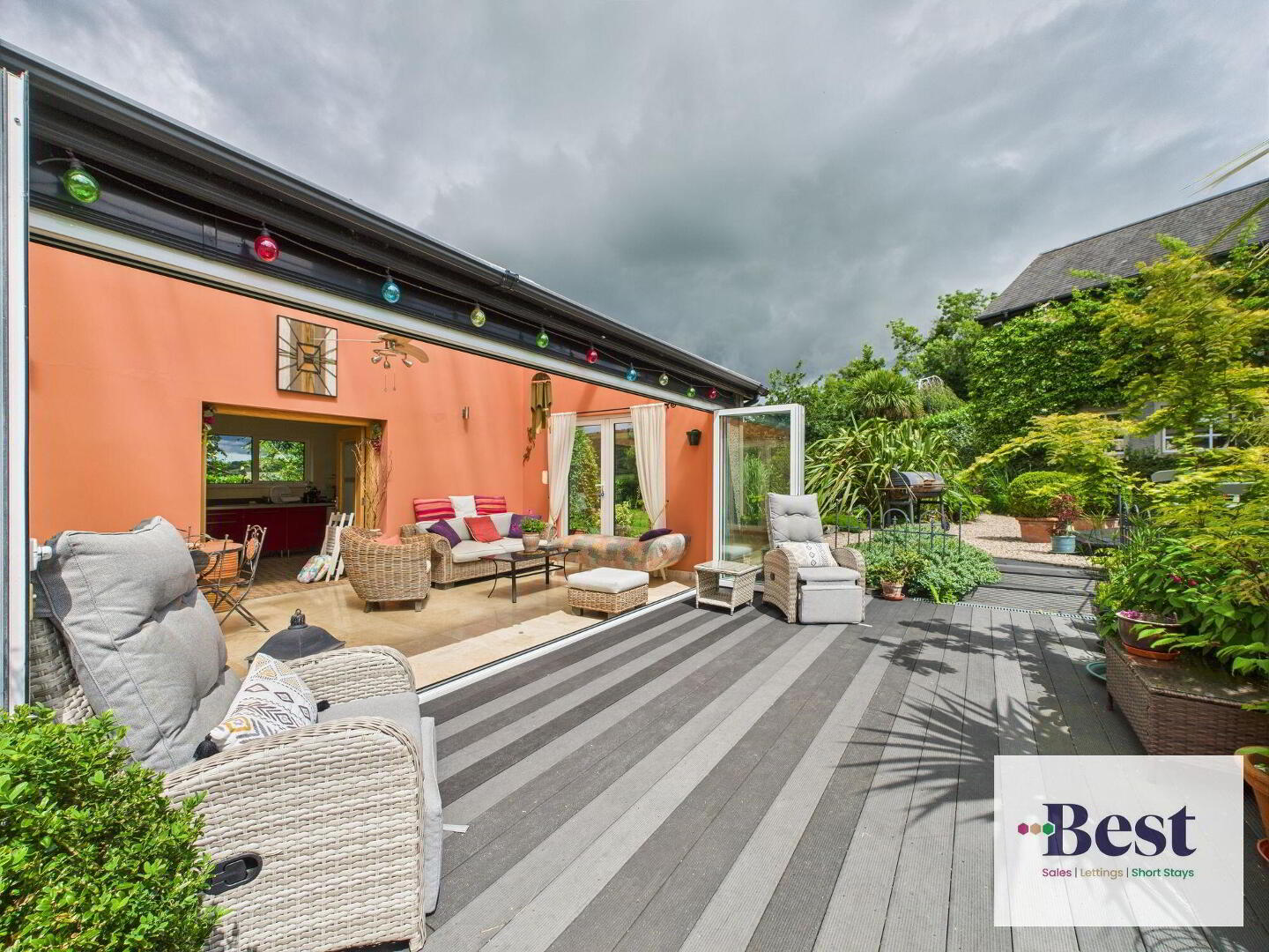 To one side we have Kitchen/ Living/ Dining space to the Conservatory which opens onto patios and leads to an outstanding Summer House.