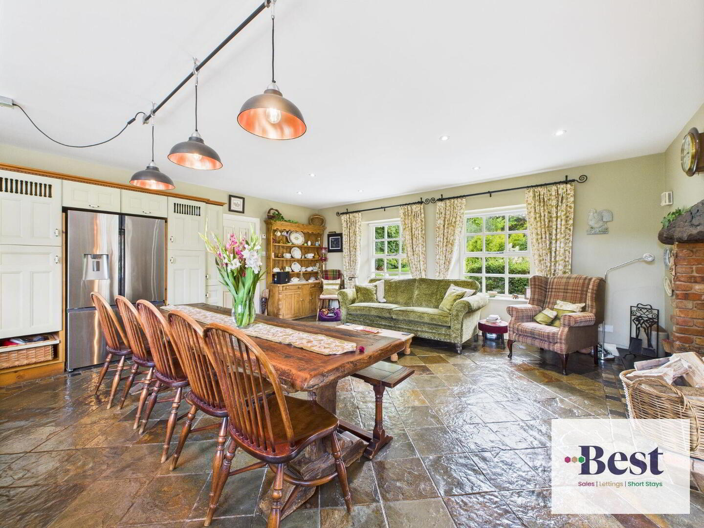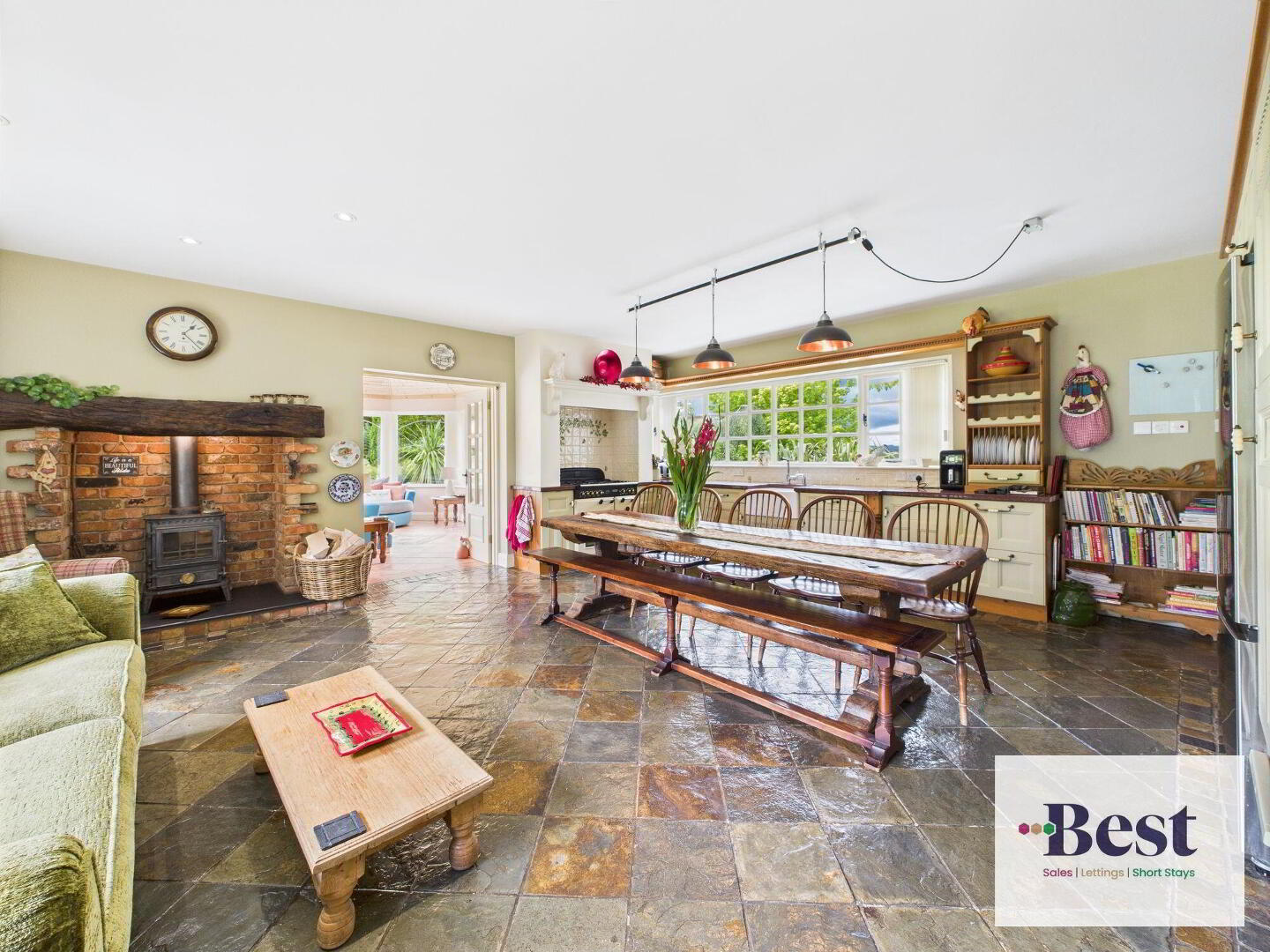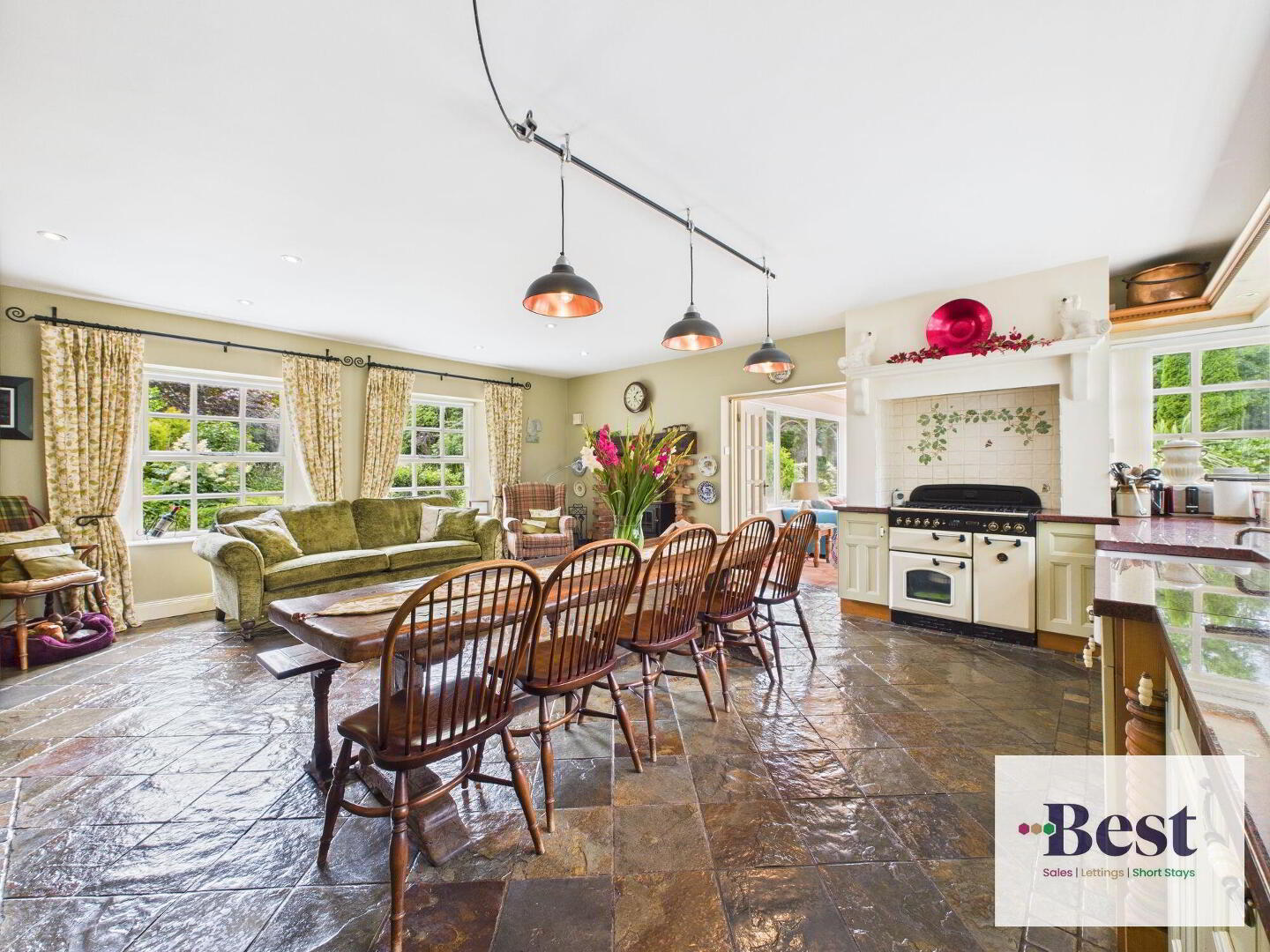 Fabulous Kitchen/ Dining/ Living space which then opens onto a large conservatory. Stunning outlook with continuous windows along the kitchen providing full garden and rural views. Excellent range of high and low level fitted units with granite work surfaces. Gas Aga cooker in alcove with feature canopy over. Integrated dishwasher. Space for American style double fridge / freezer. Belfast sink with Quooker tap. Retractable Kitchen Faucet with flexible pull out hose. Filtered water system. Cream tiled splash backs. Natural slate flooring. Rescessed lighting. Dining space currently is set up with a unique high end 18th century Spanish table and matching built in dresser. Downlights - perfect entertaining space and something the current owners may be prepared to negotiate within offers. The Living area is bright and spacious with double galzed windows over looking the front gardens and giving a beautiful cottage garden feel. This room benefits from a multi fuel glass fronted Georgian Stove set in an inglenook fireplace. Double glazed doors to: