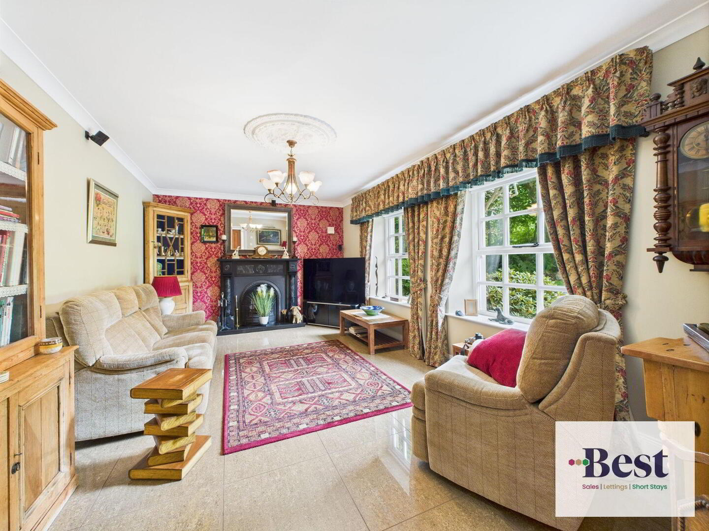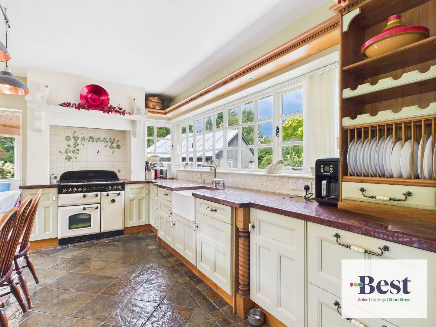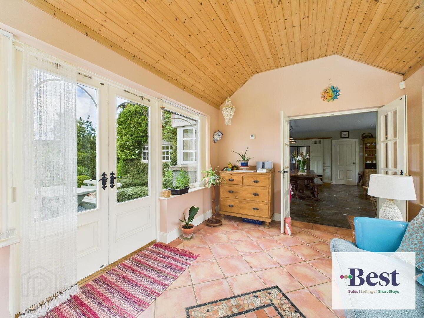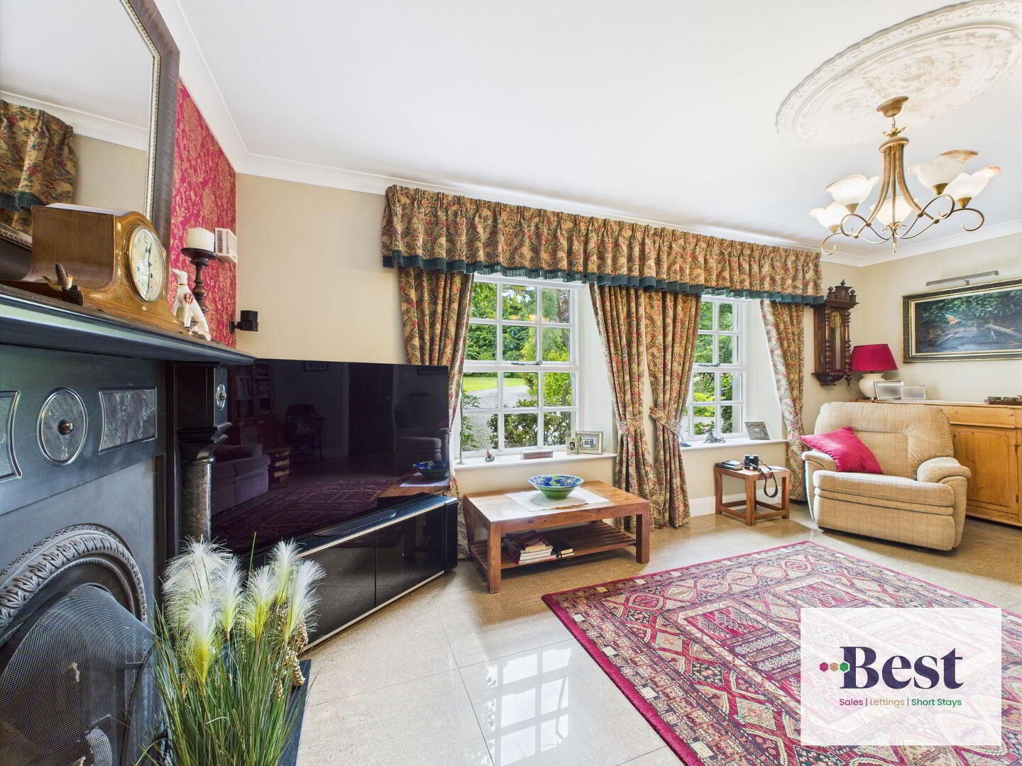 Fabulous Kitchen/ Dining/ Living space which then opens onto a large conservatory. Stunning outlook with continuous windows along the kitchen providing full garden and rural views. Excellent range of high and low level fitted units with granite work surfaces. Gas Aga cooker in alcove with feature canopy over. Integrated dishwasher. Space for American style double fridge / freezer. Belfast sink with Quooker tap. Retractable Kitchen Faucet with flexible pull out hose. Filtered water system. Cream tiled splash backs. Natural slate flooring. Rescessed lighting. Dining space currently is set up with a unique high end 18th century Spanish table and matching built in dresser. Downlights - perfect entertaining space and something the current owners may be prepared to negotiate within offers. The Living area is bright and spacious with double galzed windows over looking the front gardens and giving a beautiful cottage garden feel. This room benefits from a multi fuel glass fronted Georgian Stove set in an inglenook fireplace. Double glazed doors to: