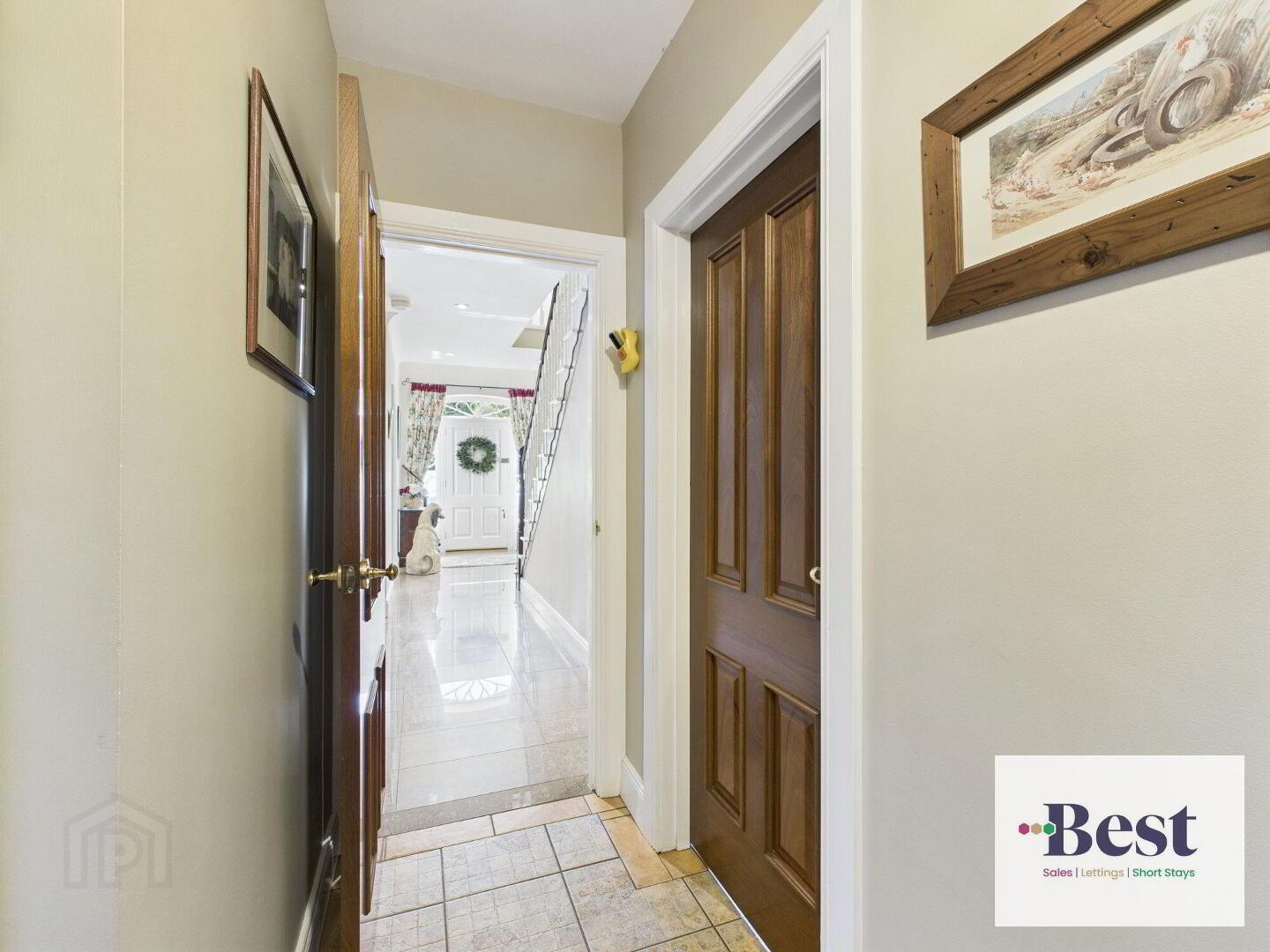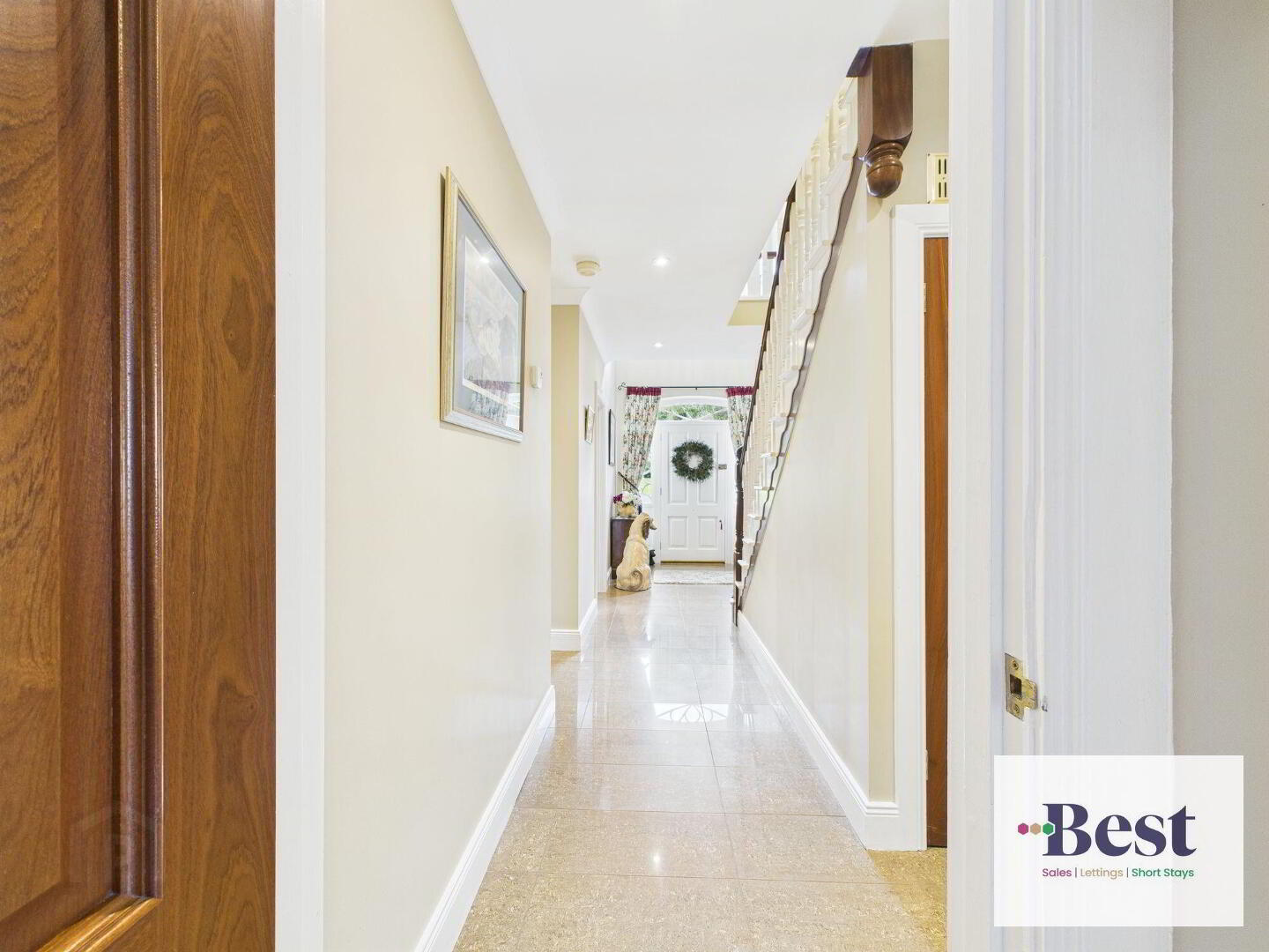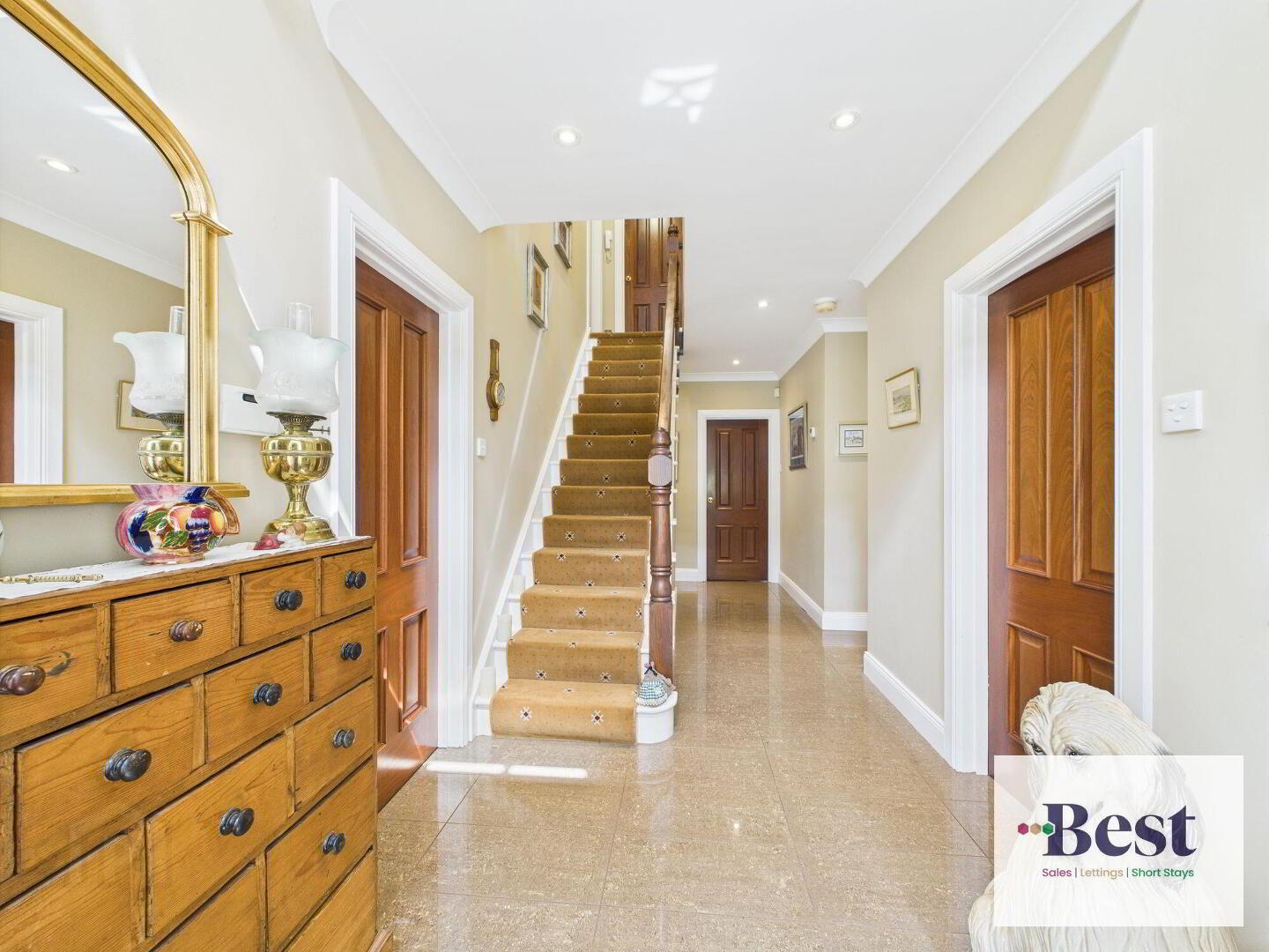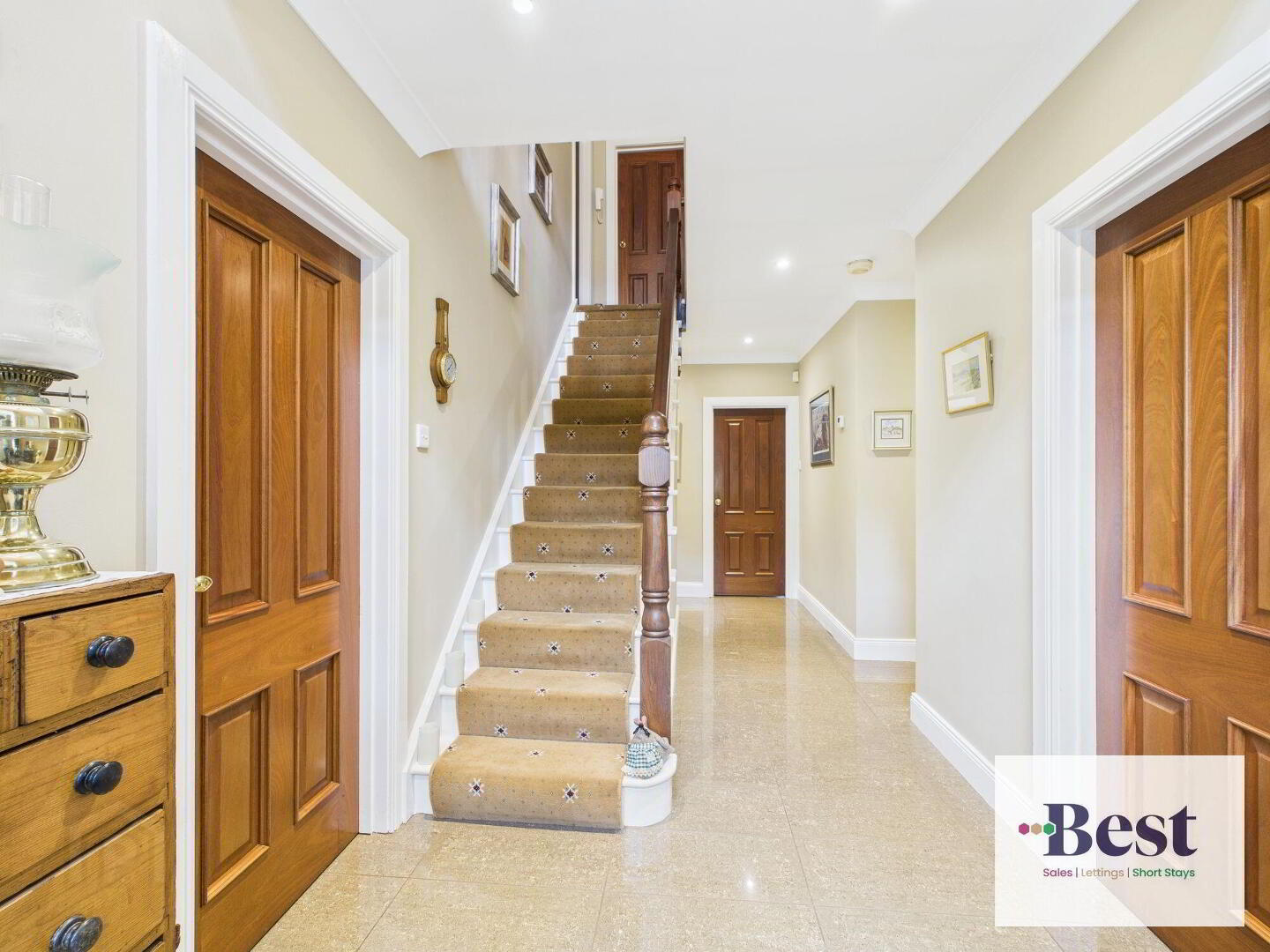 Lovely wide front door with side panels and attractive arched fan light giving lots of light into a beautiful wide hallway with tiled flooring and a feature chandelier above mezzanine landing. Conrice ceiling and rose. Downstairs Cloakroom. Timber framed glazed doors throughout. Underfloor Oil heating with thermostatic controls downstairs. Electronic system to control light and sound zones. Staircase to first floor.