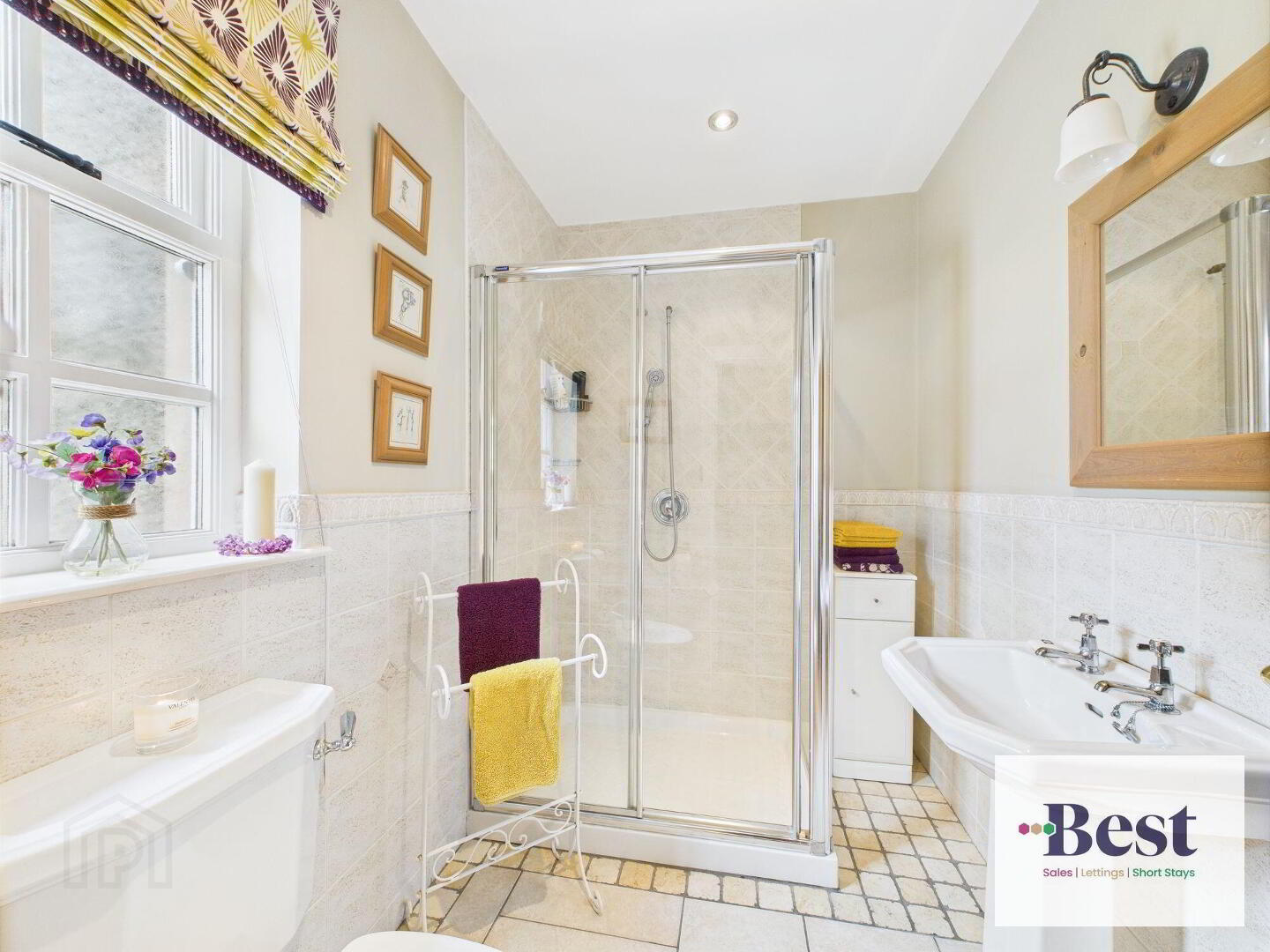Ground floor shower room with white suite comprising low flush WC, pedestal wash and basin and shower cubicle (1200 x 900) with glass doors and Aqualisa Power Shower. Low voltage spot lights. Jerusalem stone tiled floor.
