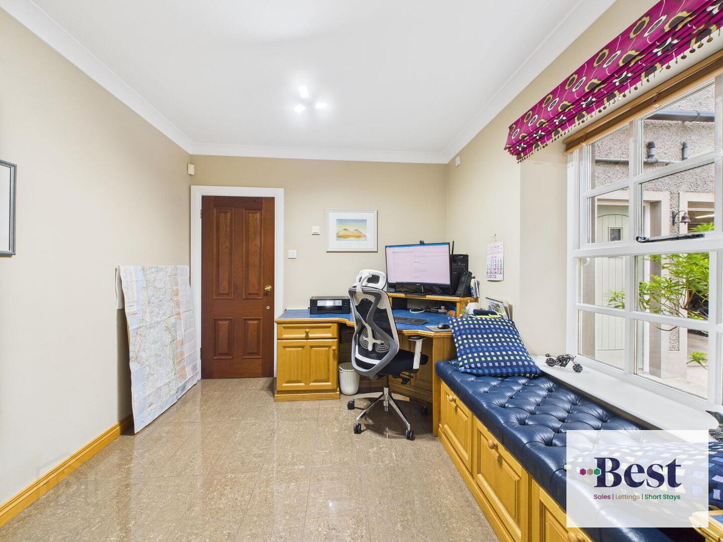 Currently used a office / study, this third reception room benefits from dual aspect windows, natural tiled flooring and has another feature fireplace with a a slate hearth and gas inset. It has been professionally fitted with solid ash office units with a built in filing system and Leather seating. Feature Cornice ceiling.
