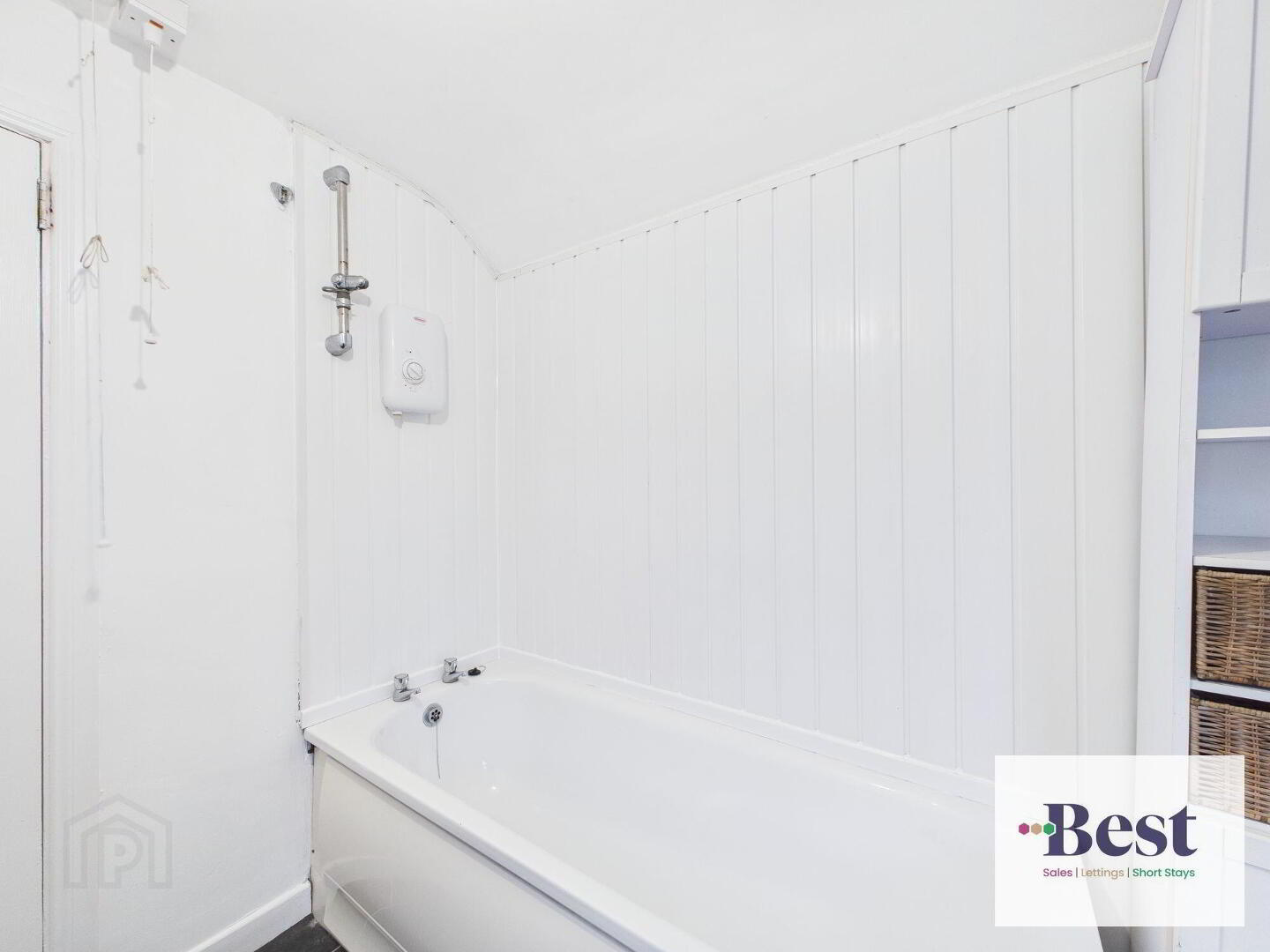 White suite comprising of low flush W/C, pedestal wash hand basin and panelled bath with electric over shower. PVC panelled walls and tile effect vinyl flooring.