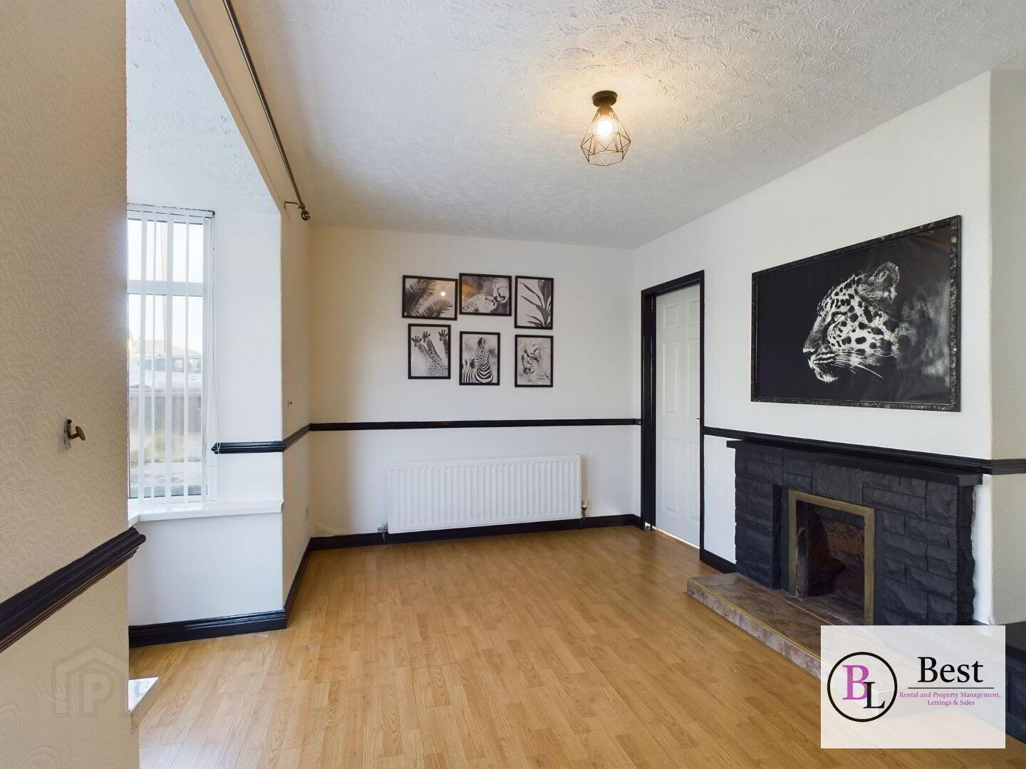 great size room into a bay window. Fireplace. Laminate wood flooring