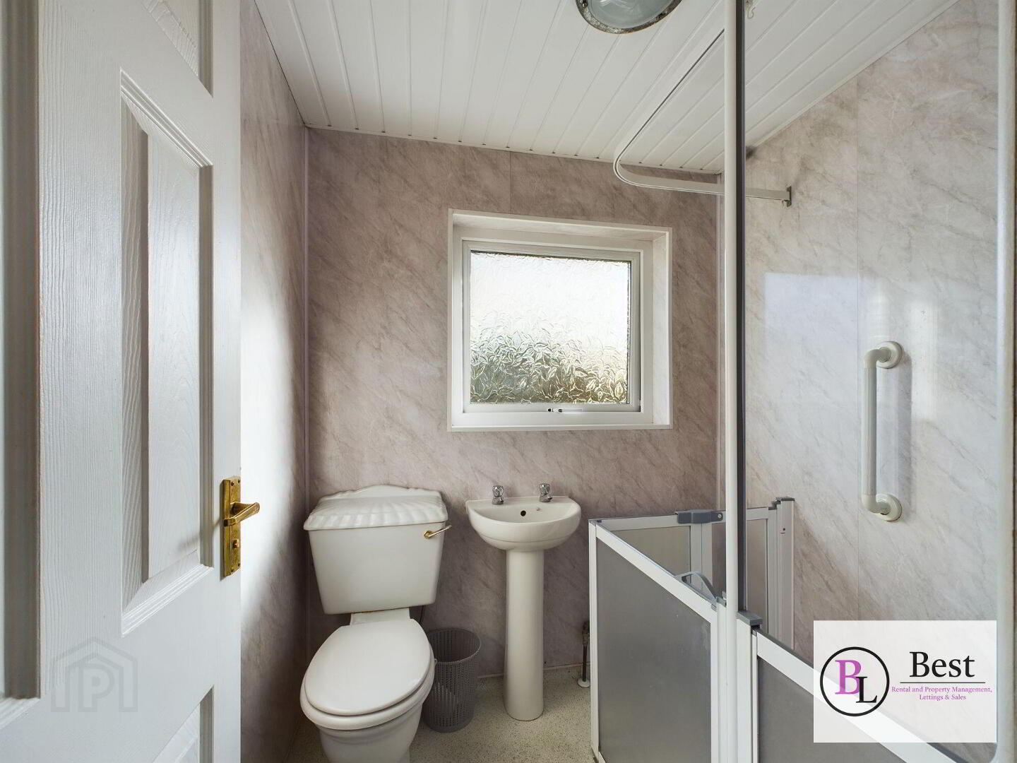 Shower room with WC, sink and disability access shower. PVC panelled walls and ceilings give a fresh well maintained space