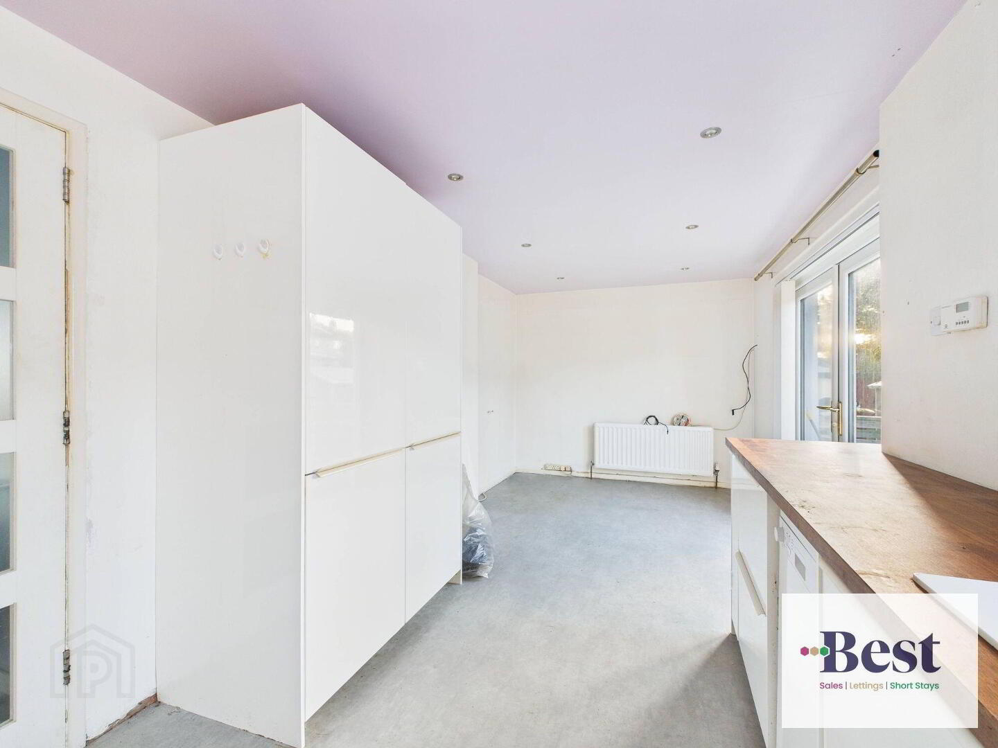 - Modern L shaped kitchen with good range low level units. Features integrated oven/ hob, fridge freezer, tall larder and space for an under-counter dish washer. Follows into an open plan dining area with rear garden access via french doors.