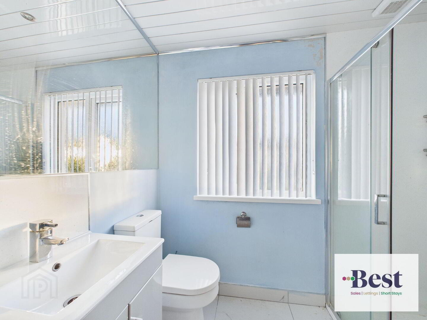 - Bright bathroom with tiled flooring and skirting, featuring a modern white suite comprising of low flush wc, vanity unit with mixer tap, large mirror and spacious shower enclosure with electric shower and panelled walls.