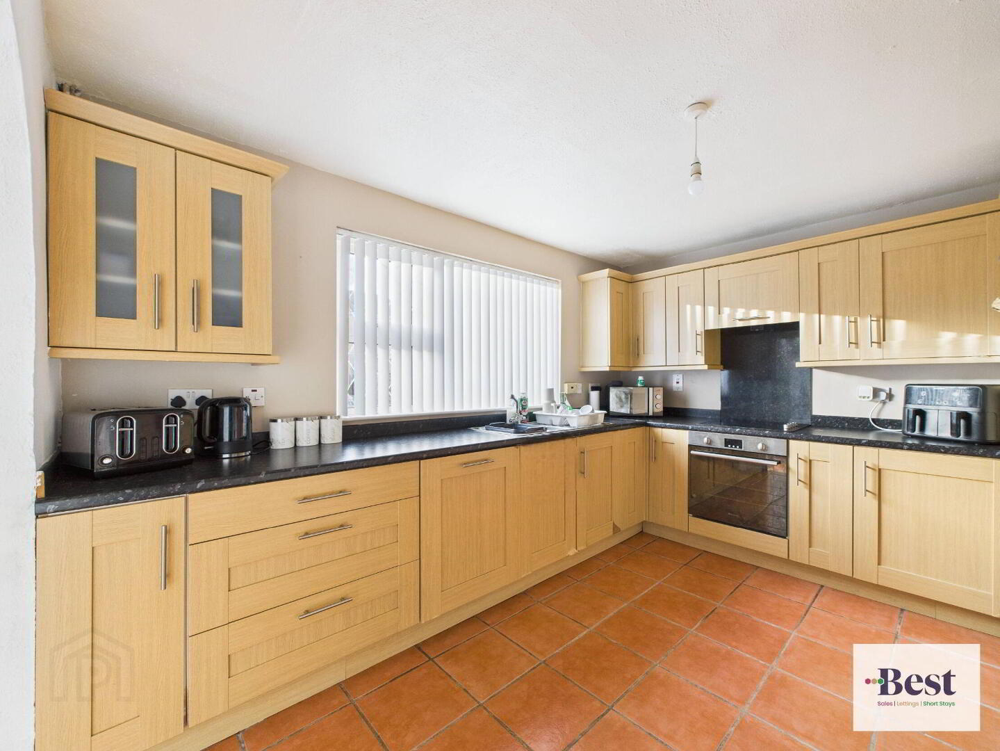 Large L shaped kitchen with an excellent range of low and high level units. Featuring laminated worktops, wood effect shaker style units, integrated electric oven, 4 ring electric hob, integrated 'pull out' extractor fan, integrated dishwasher and space for integrated fridge / freezer. Plenty of room for dining. Tiled flooring with large rear facing window overlooking garden area.