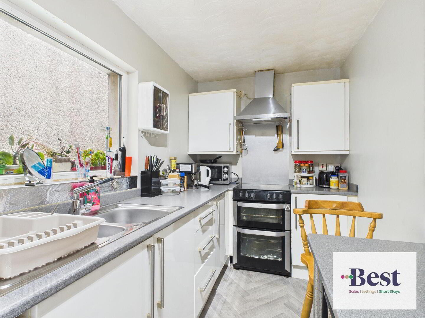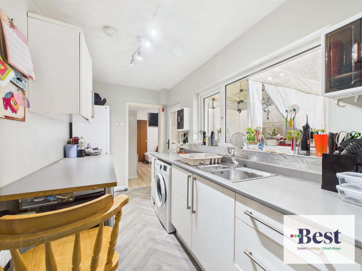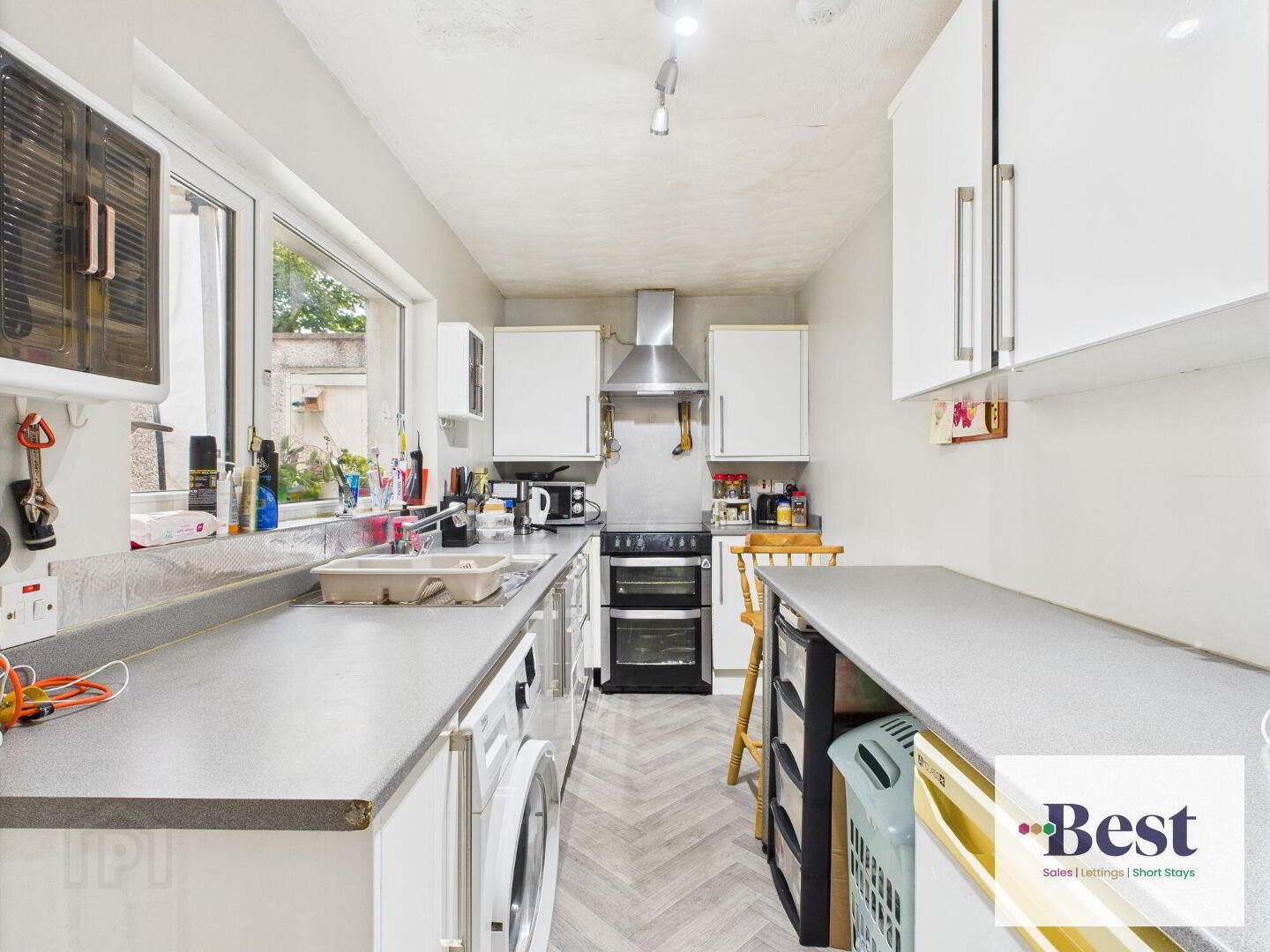Excellent range of high and low level units and plenty of work top space. Breakfast bar. Space for cooker and other appliances. Door to rear garden.