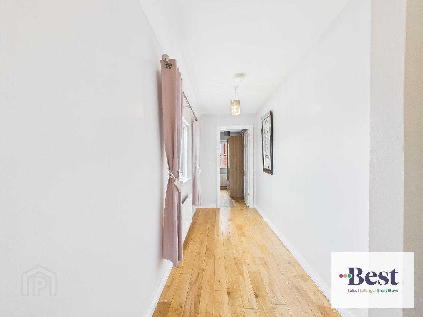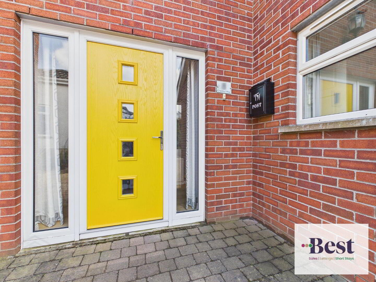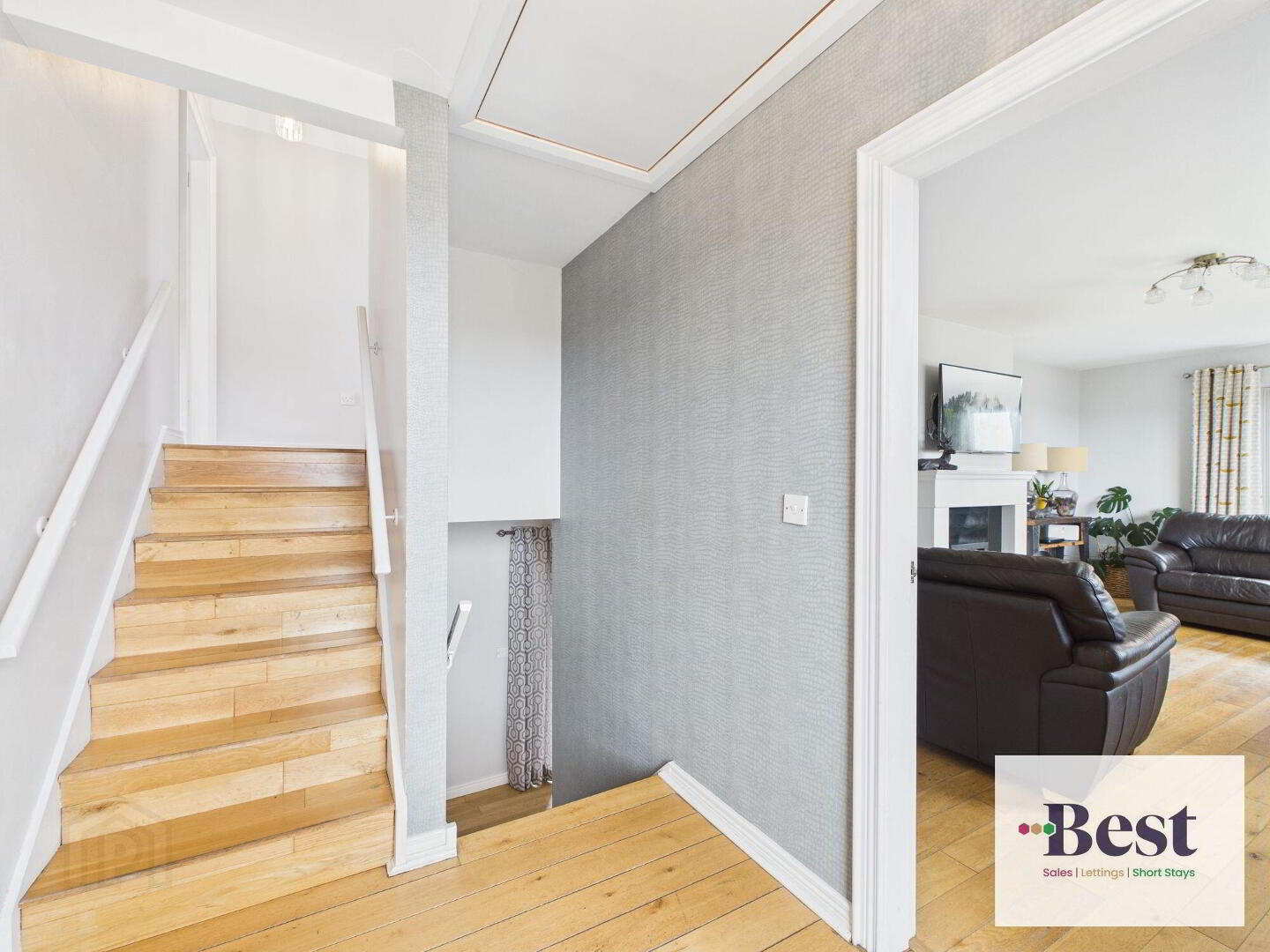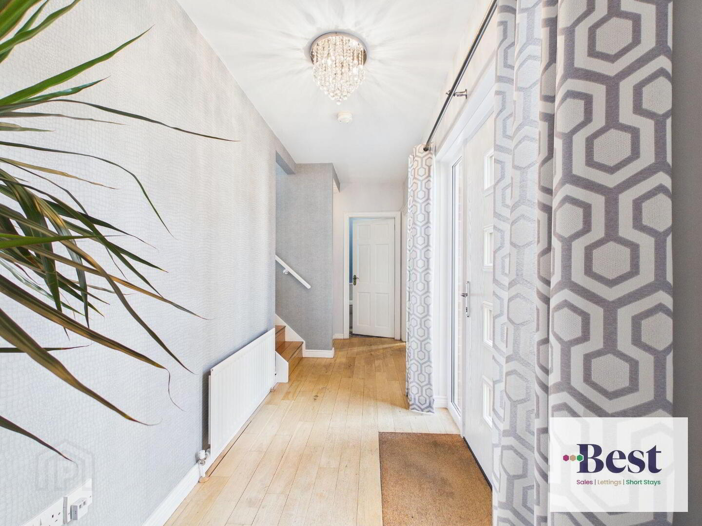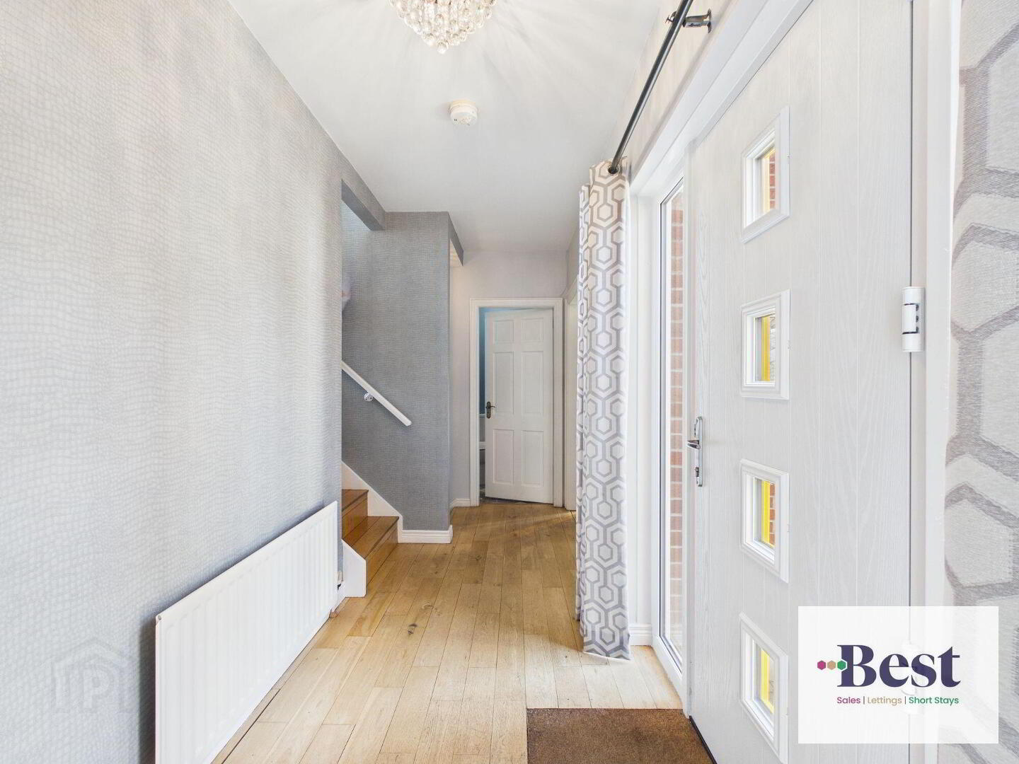 - Striking feature composite front door opening to a beautiful bright and elegant entrance hall with floor to ceiling windows. Solid wood flooring.