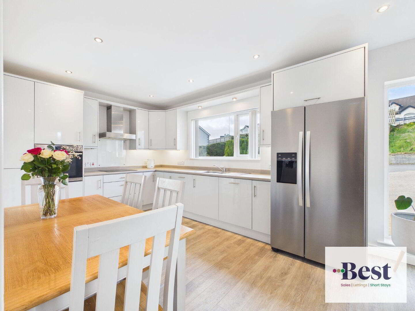 - Excellent range of high and low level white gloss kitchen units with contrasting work surfaces. Built in eye level oven, four ring hob and stainless steel extraction over. Integrated dishwashers. Space and plumbing for American Fridge Freezer. Laminate wood flooring. Ample space for table and chairs Open to utility and storage area. PVC door to enclosed side garden with washing line etc.