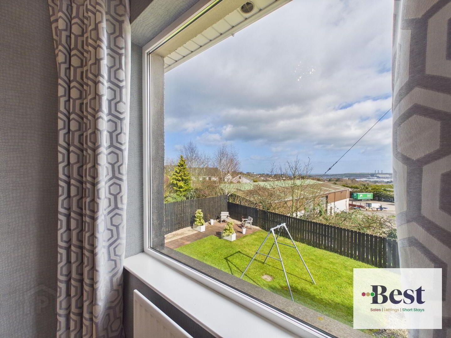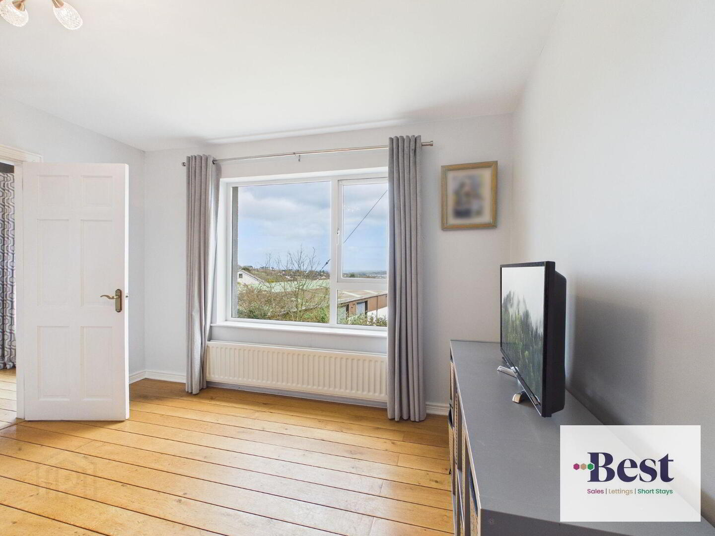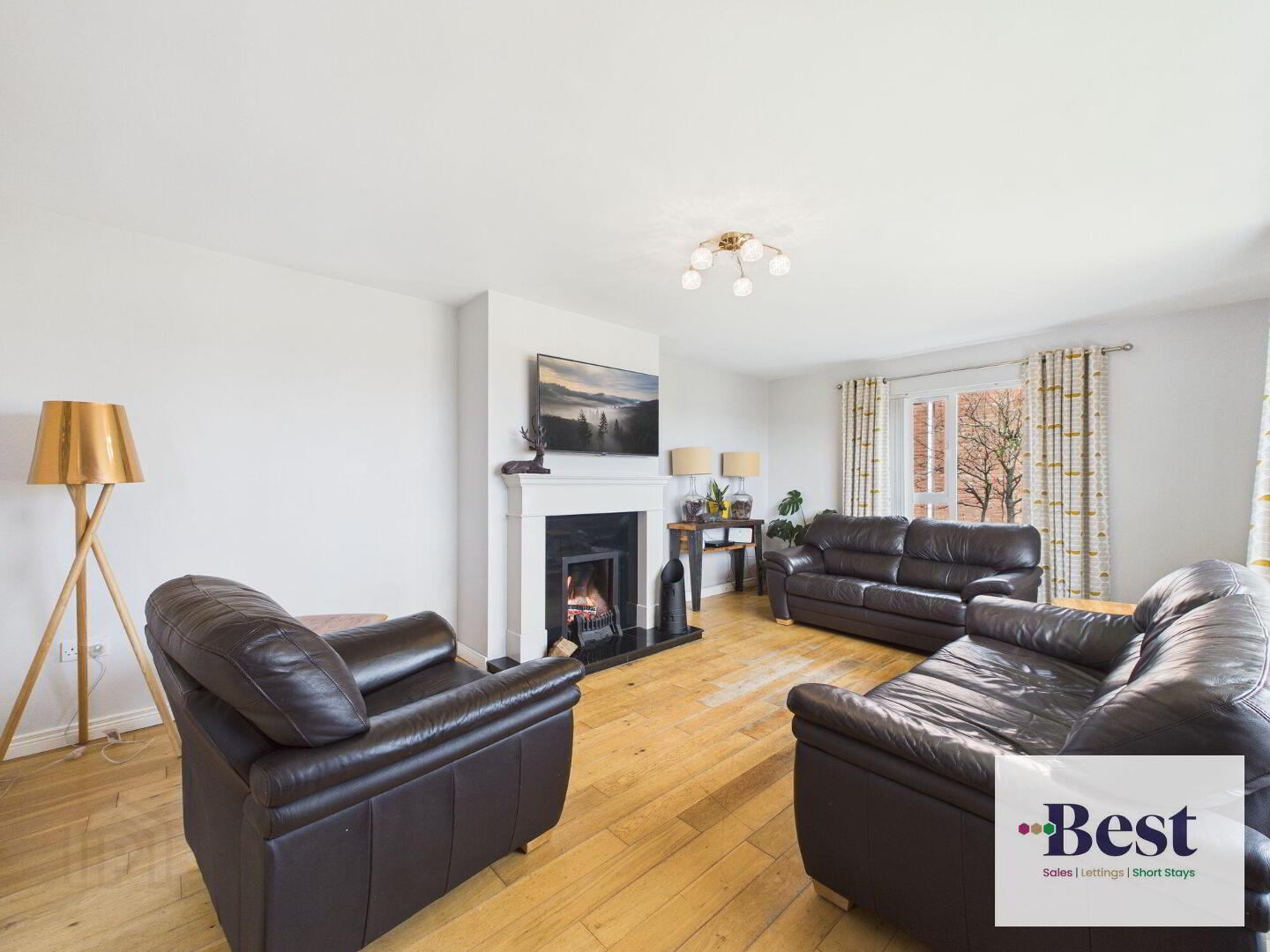 - Large bright room with dual aspect windows. Feature fireplace with white surround, black marble effect inset and hearth. Gas Fire. Fab elevated views over Larne towards harbour and across the lough. Solid wood flooring