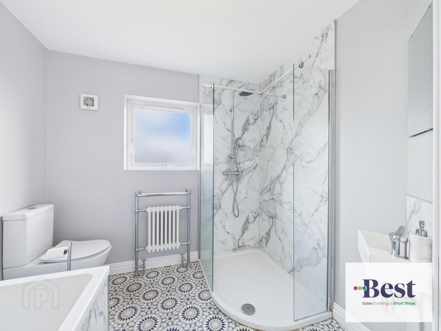 - Modern white suite comprising large bath, low flush WC and wall mounted sink. Separate shower cubicle with thermostatically controlled rain shower. White and grey marbled PVC paneling and feature flooring.