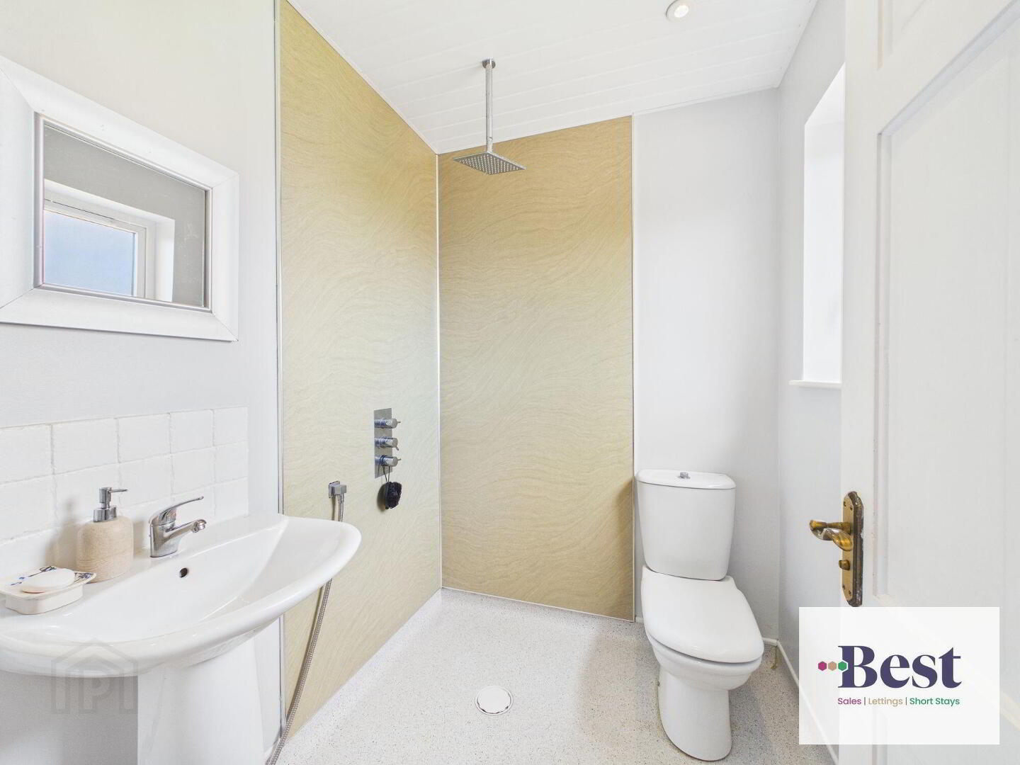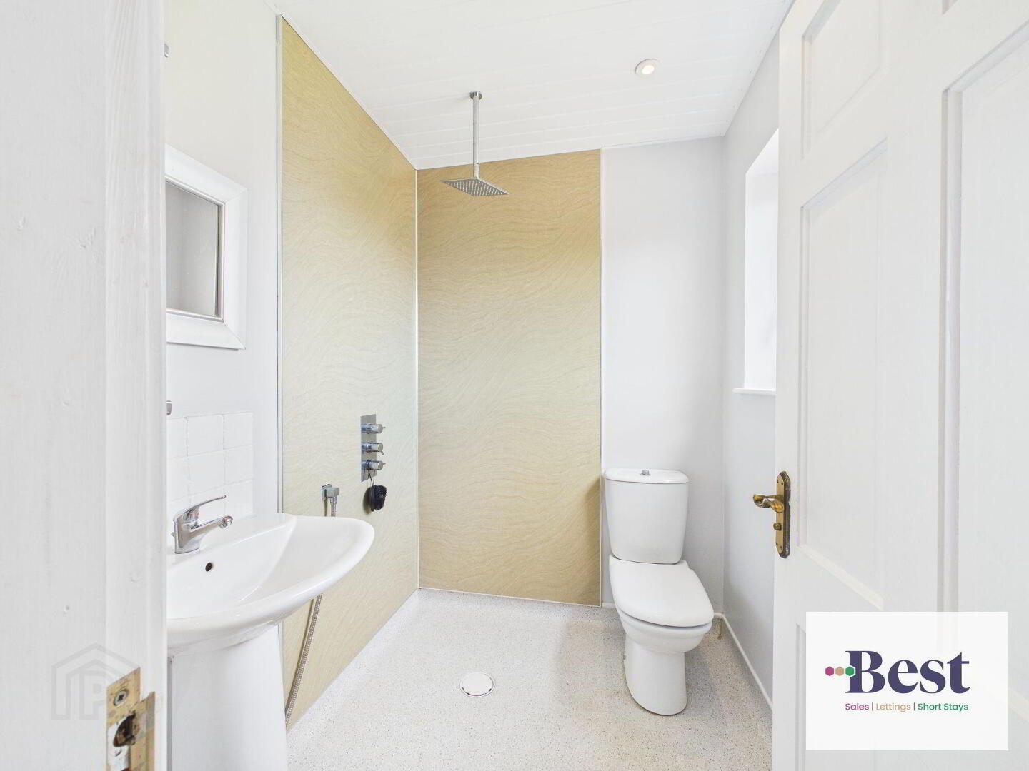- Modern wet room with low flush WC, pedestal wash hand basin and thermostatically controlled rain shower.